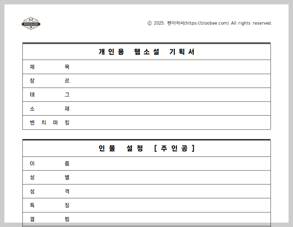 개인용 웹소설 기획서 양식 미리보기 Copyright 2025. 펜아저씨의 웹소설 대장간 All rights reserved.
